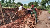 Babinsa Kerja Bakti Bersama Warga Bangun Tembok Penahan Tanah di Desa Masaran