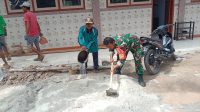 Walaupun Di bulan Puasa, Babinsa dan Warga Tetap Semangat Gotong Royong Cor Jalan Desa