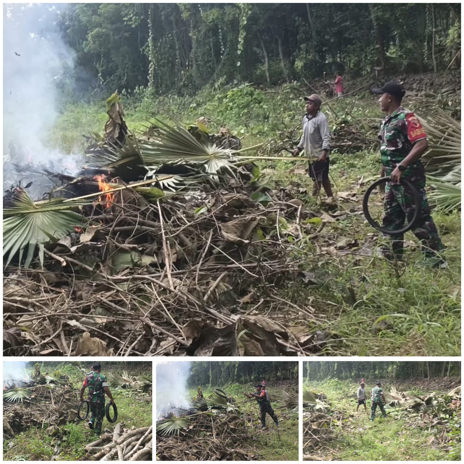 SUMENEP – Bintara Pembina Desa Koramil 06/Saronggi Kodim 0827/Sumenep Koptu Sugiyanto membantu membersihkan lahan milik warga yang berada di Desa Langsar Kecamatan Saronggi Kabupaten Sumenep, Selasa (27/1/2026).