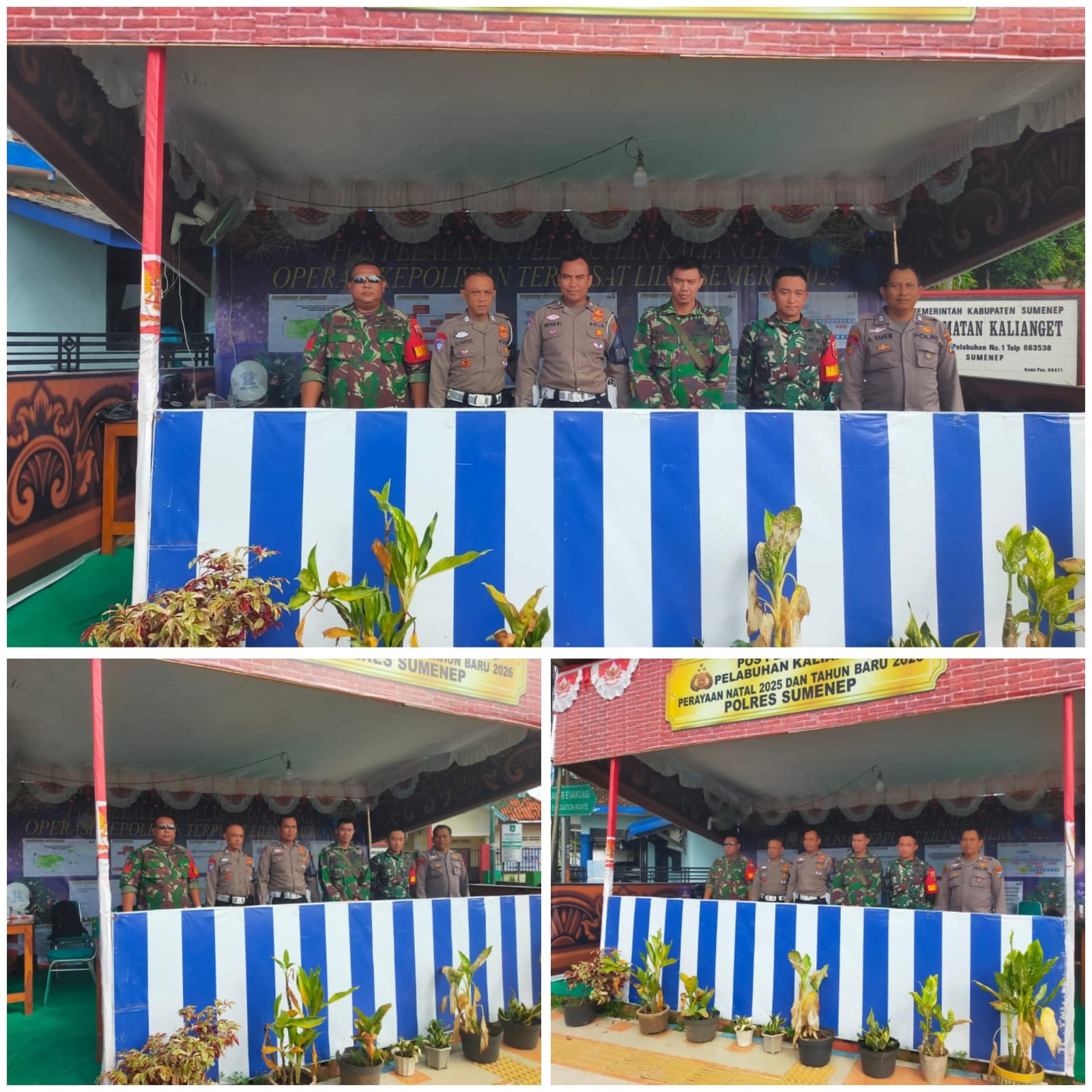 SUMENEP – Aparat gabungan TNI, Polri, Satpol PP, dan tenaga kesehatan melaksanakan pengamanan Natal 2025 dan Tahun Baru 2026 (Nataru) di Pos Pantau Pelabuhan Kalianget, Kabupaten Sumenep, Kamis (1/1/2026).